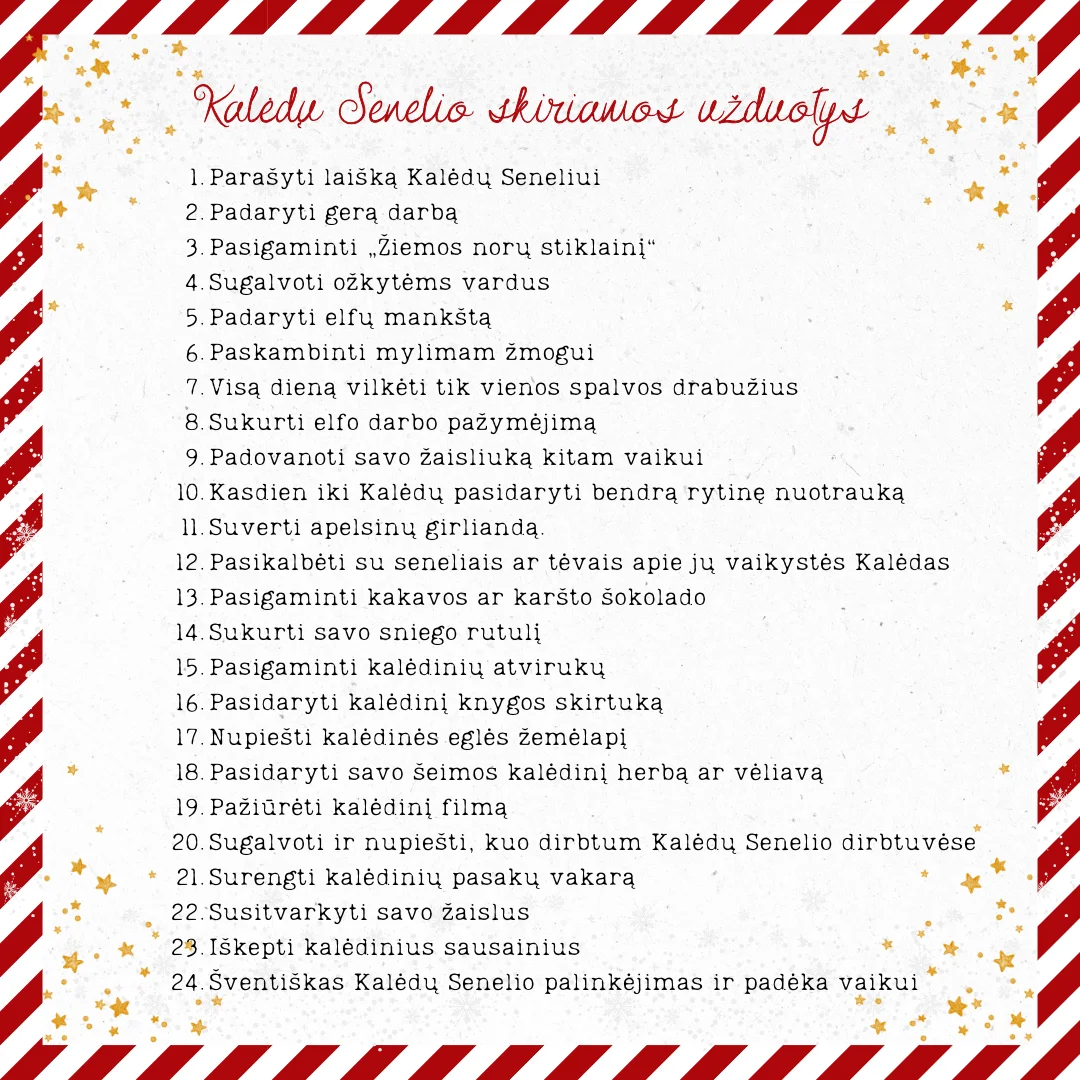 - Kalėdų Senelio skiriamos užduotys yra kūrybinės arba susiję su gerais darbais, todėl yra pritaikomos visiems vaikams, kurie tiki Kalėdų Seneliu, nepriklausomai nuo vaiko amžiaus