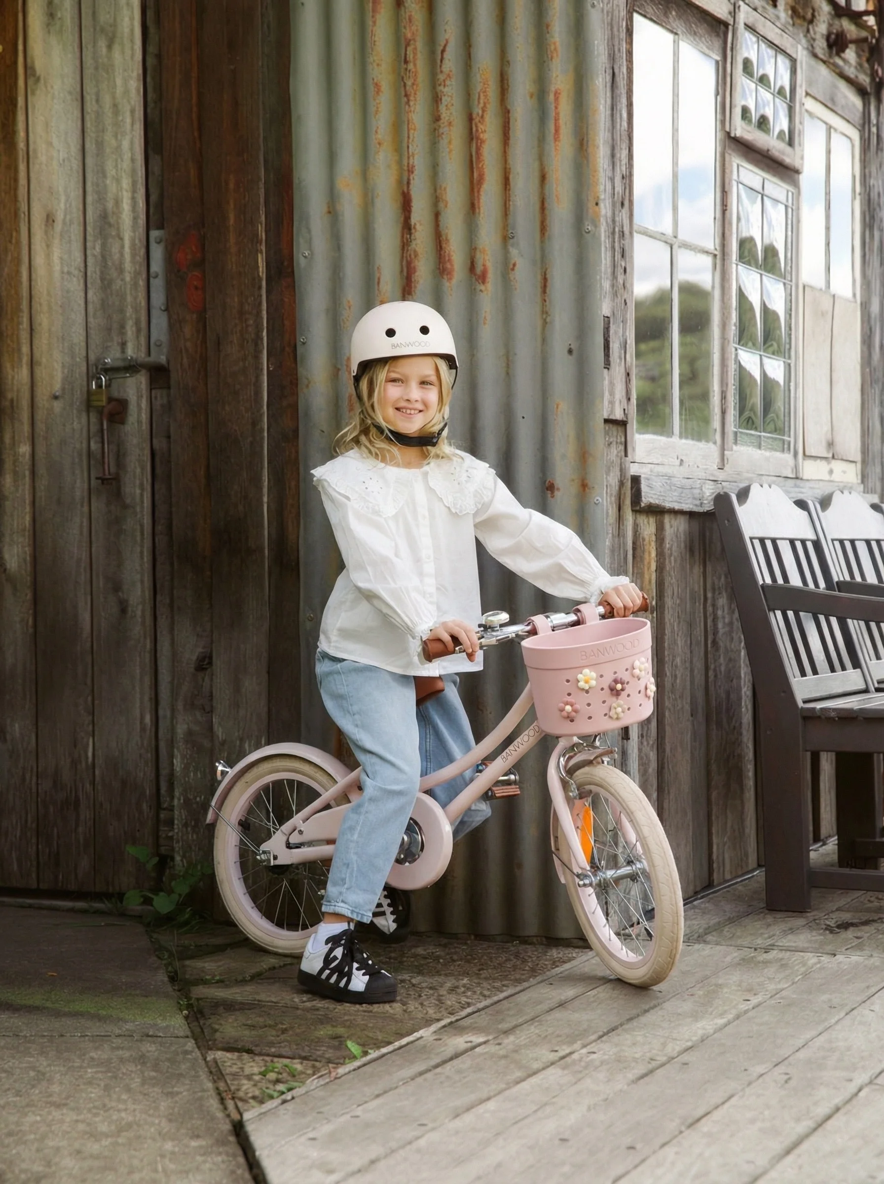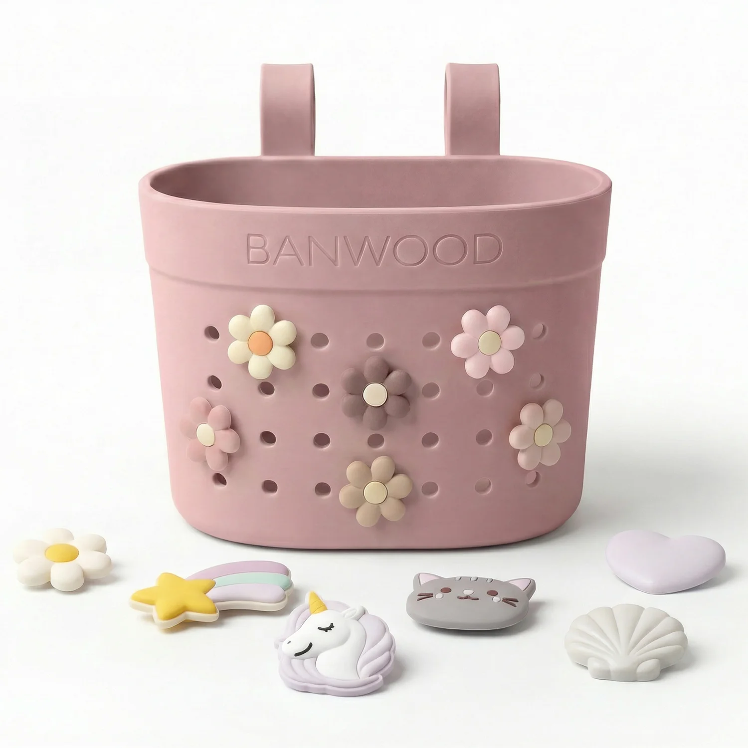 Stilingas krepšelis dviračiui ar paspirtukui, kurį vaikas gali papuošti Banwood ženkliukais (parduodami atskirai) ir sukurti unikalų savo transporto priemonės stilių.