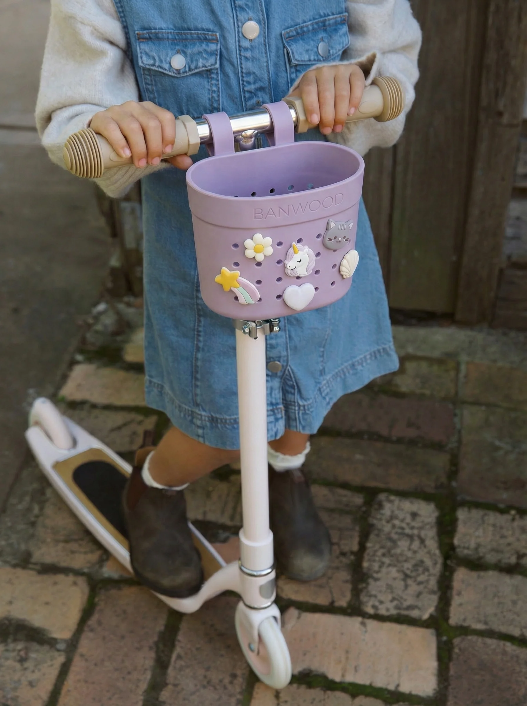 Stilingas krepšelis dviračiui ar paspirtukui, kurį vaikas gali papuošti Banwood ženkliukais (parduodami atskirai) ir sukurti unikalų savo transporto priemonės stilių.