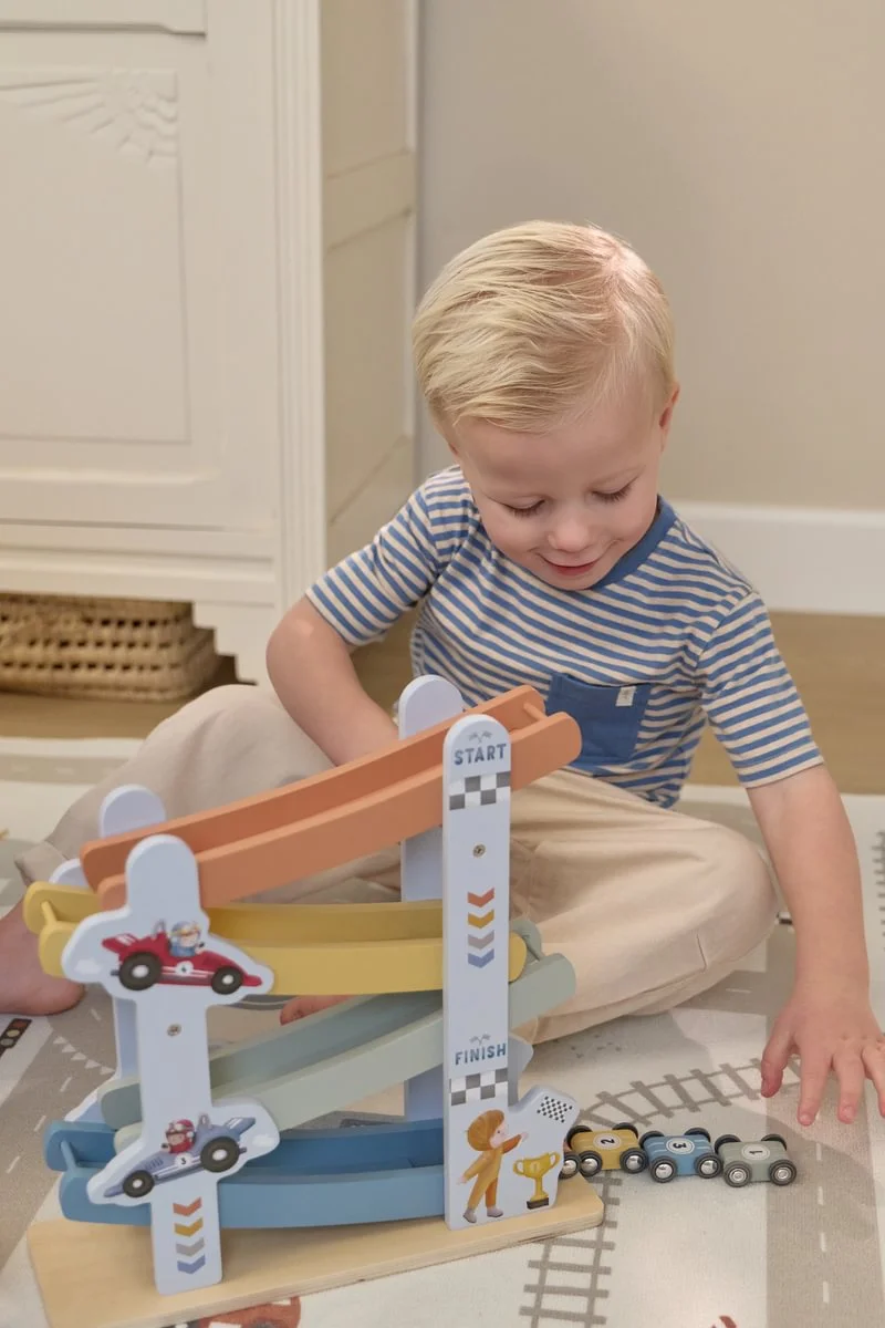 Vienas..du..trys! Skriejam! Tai bent medinė trasa! Keturi automobiliai lenktyniauja leisdamiesi žemyn. Automobilių gerbėjai liks sužavėti žaisdami šia medine trasa. Tiks tiek berniukui, tiek mergaitei. Labai smagus ir įtraukiantis žaislas. Pastelinių spalvų, pagaminta iš sertifikuotos medienos, puikiai žiūrėsis bet kuriame kambario interjere.