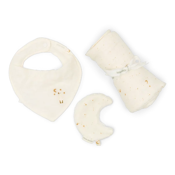 Rinkinį sudaro 3 būtini daiktai: muslino audinio pledukas, minkštas čiulptuko pakabukas su mielu mėnulio ir žvaigždžių raštu bei ramios švelnios baltos spalvos seilinukas su mielais siuvinėjimais. Deranti dėžutė ne tik puikiai tinka dovanai.