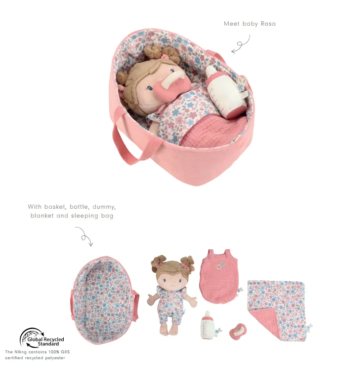 Susipažinkite su mažyle Rosa. Šią mielą mažą pliušinę lėlę norisi priglausti ir sūpuoti. Mažylė Rosa taps geriausia kiekvienos mažos mergaitės ar berniuko drauge. Vaikai gali ją pamaitinti buteliuku arba nuraminti duodami čiuptuką. Jie gali pakeisti jai vystyklą ir uždėti antklodę. Mažylei Rosai taip pat patinka leistis į keliones savo mielame kelionių lopšyje.