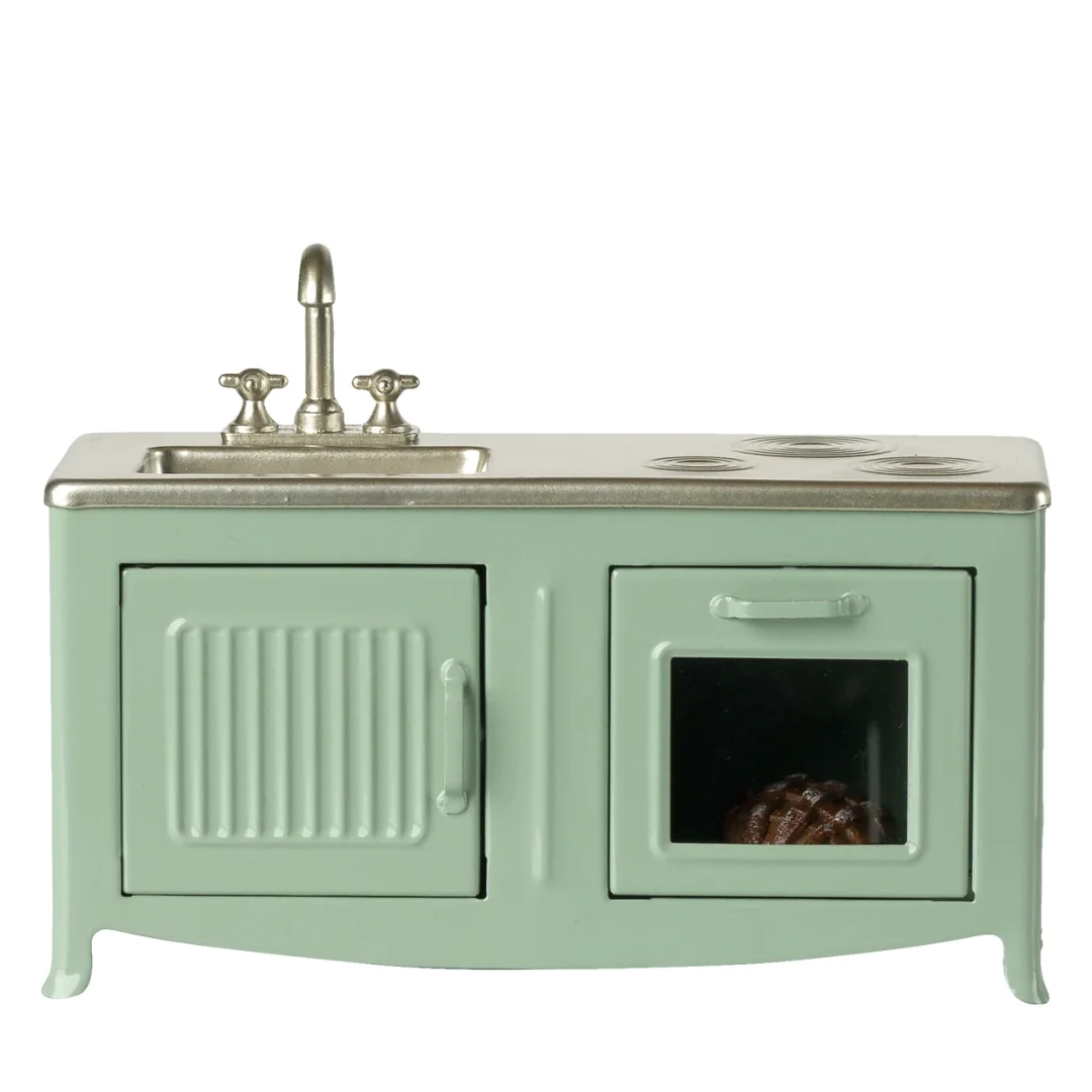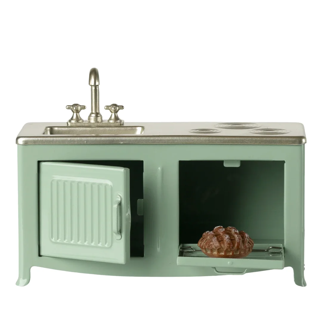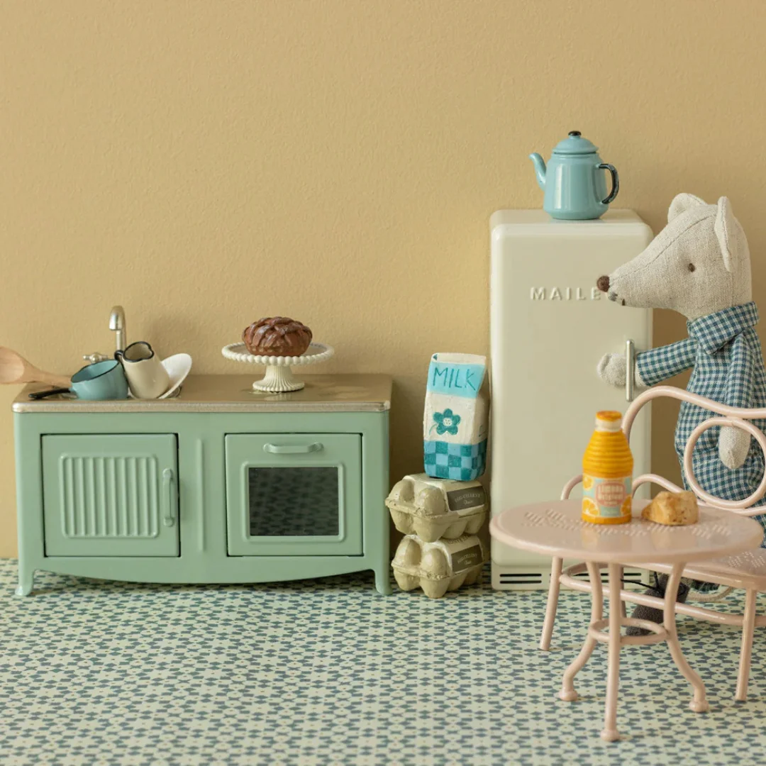 Kiekvienų namų širdis yra virtuvė. Lygiai taip pat ir peliukų pasaulyje! Ši nuostabi metalinė Maileg virtuvė yra gražių spalvų tonų su daug realistiškų detalių, tokių kaip spintelės durys, kriauklė ir orkaitė su ką tik iškeptu pyragu. Vintažinė virtuvė puikiai derės mažųjų Maileg gyventojų namučiuose.
