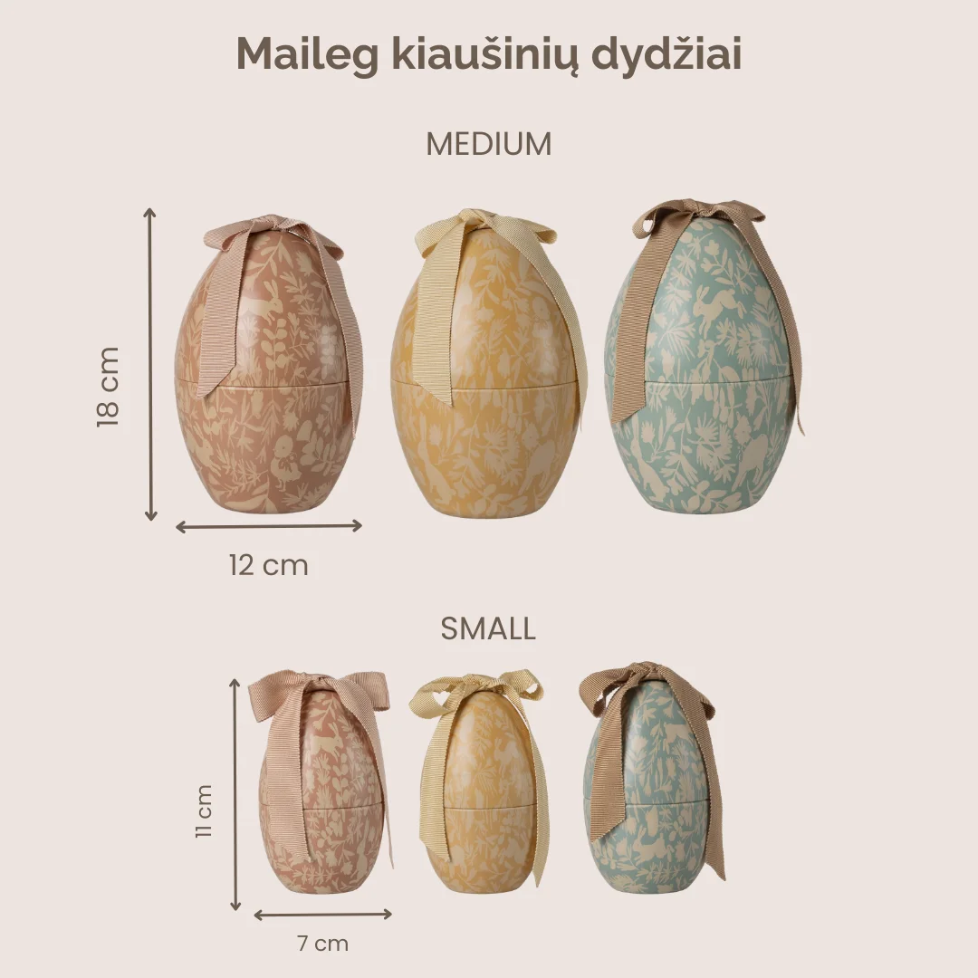 Dailiai dekoruotas Maileg metalinis atsidarantis kiaušinis, įkvėptas vintažinių raštų. Į kiaušinio vidų galima įdėti gardumynų ar nedidelę dovanėlę (į vidų telpa Maileg zuikis). Maileg metalinis kiaušinis taps gražia detale vaikų kambario lentynoje.
