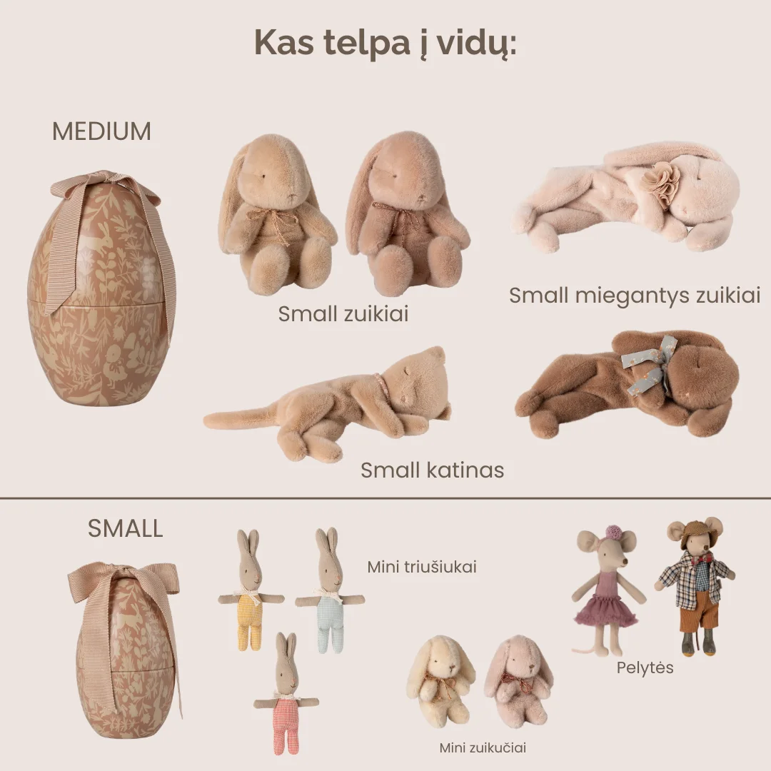 Šis kruopščiai suderintas Velykų rinkinys yra puiki alternatyva šokoladui. Jame rasite dailiai dekoruotą Maileg metalinį Velykinį kiaušinį, kurio viduje slepiasi mielas Maileg triušiukas. Tai dovana, kuri džiugins ne tik Velykų rytą, bet ir taps gražia detale vaikų kambario lentynoje. Maileg žaisliukai yra kolekciniai, todėl turi išliekamąją vertę.