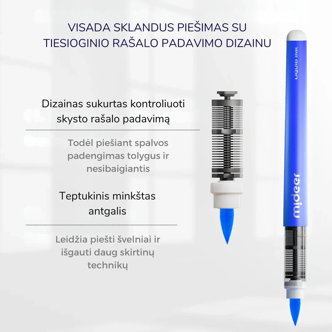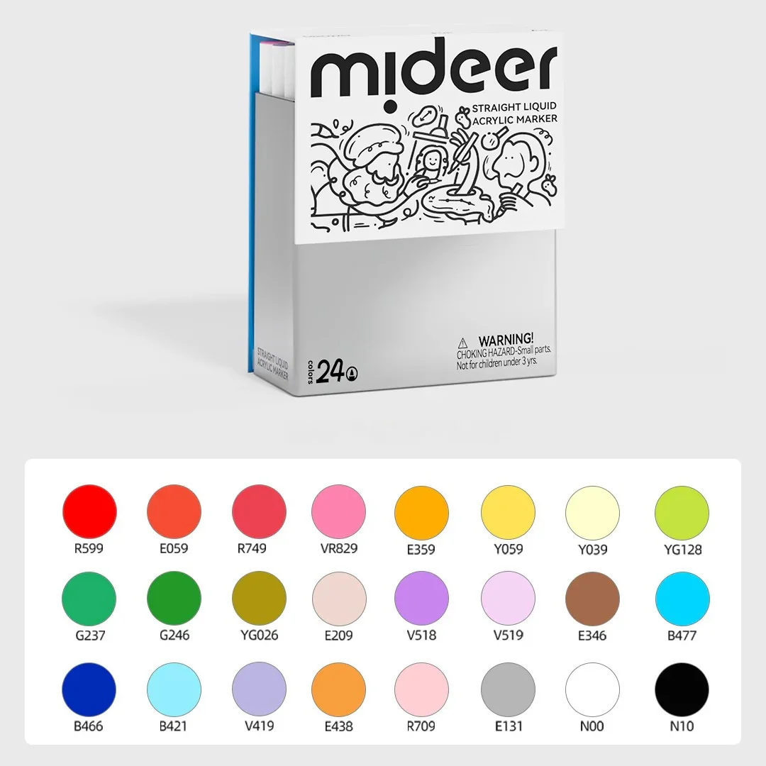 Mideer akriliniai markeriai su skysto rašalo užpildu, aprūpinti išmania rašalo kontrolės sistema, užtikrinančia tolygų padengimą ir neleidžiančia rašalui pratekėti. 0,5–5 mm nailono minkštas šepetėlio galiukas, užtikrinantis sklandų ir tolygų piešimą. Šis rinkinys leidžia kurti meninius darbus ant įvairių paviršių, tokių kaip keramika, stiklas, medis, audinys, akmuo, metalas, plastikas, kalėdinės dekoracijos, Helovino piešiniai, gimtadienio dovanos ar bet kokie „pasidaryk pats“ projektai. Visos spalvos yra ryškios ir sodrios. Taip pat gali būti naudojami daugiasluoksniam spalvų derinimui. Spalvos neblunka ir nepersisunkia per popierių.