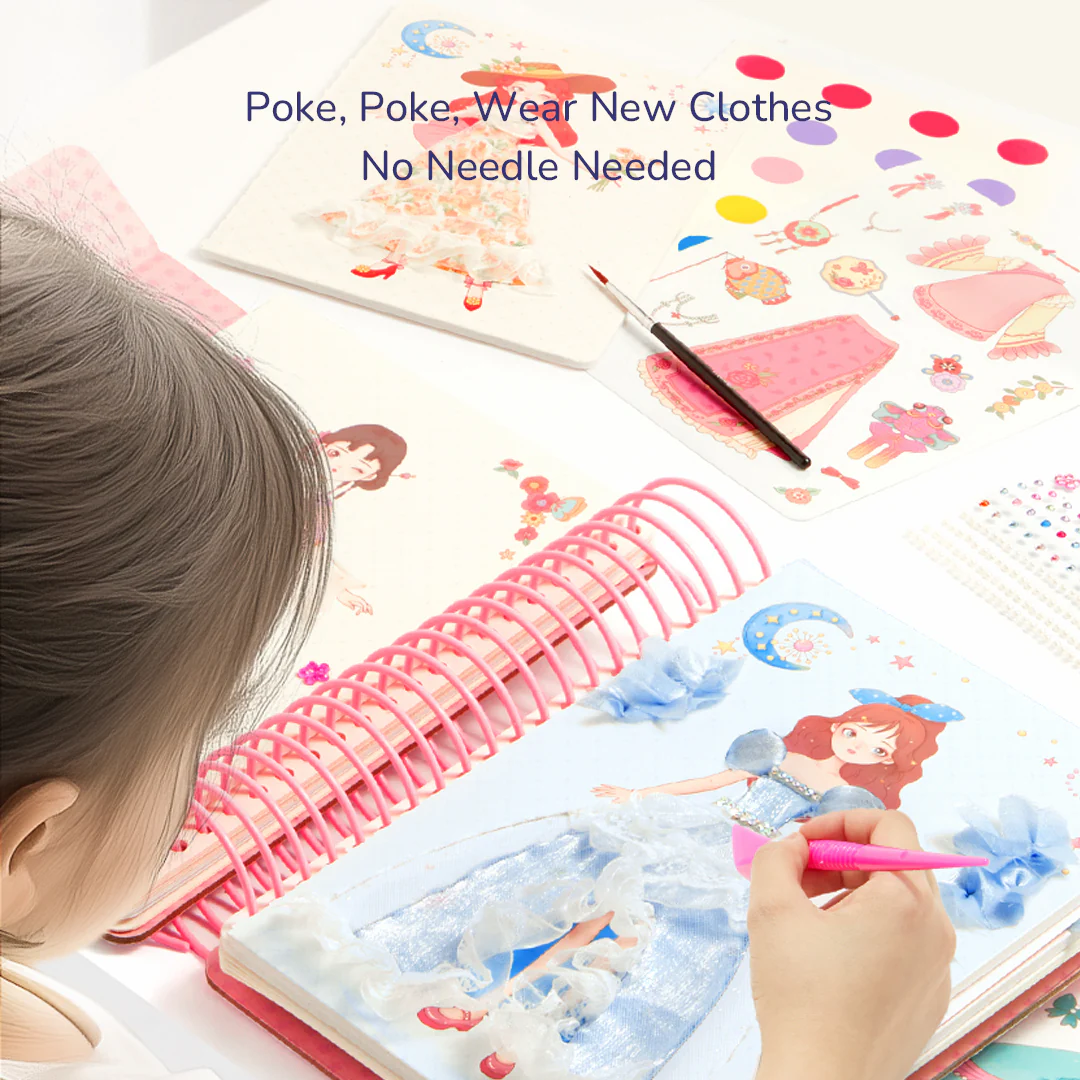 - Komplekte: 4 kostiumų „poke“ puslapiai, 5 lipdukų puošimo puslapiai, 5 piešimo puslapiai, 2 veido dažymo puslapiai, 4 lipdukų lapai, drabužių trafaretai, 1 audinio pakuotė, 1 deimantų lipdukų lapas, 1 šepetėlis, 1 „poke“ įrankis;