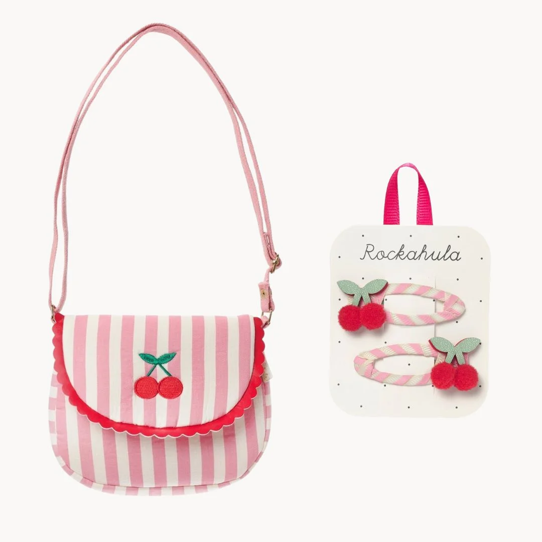 Vyšnios – šio sezono topas! Todėl šį rinkinį mergaitės pamils iš pirmo žvilgsnio. Rinkinyje: žavingas rankinukas su siuvinėtomis vyšniomis ir priderinti plaukų segtukai. Aksesuarus puošia vyšnios, todėl juos lengva derinti. Tobulas pasirinkimas šiltojo sezono kelionėms, išvykoms, šventėms ar tiesiog kasdienai.